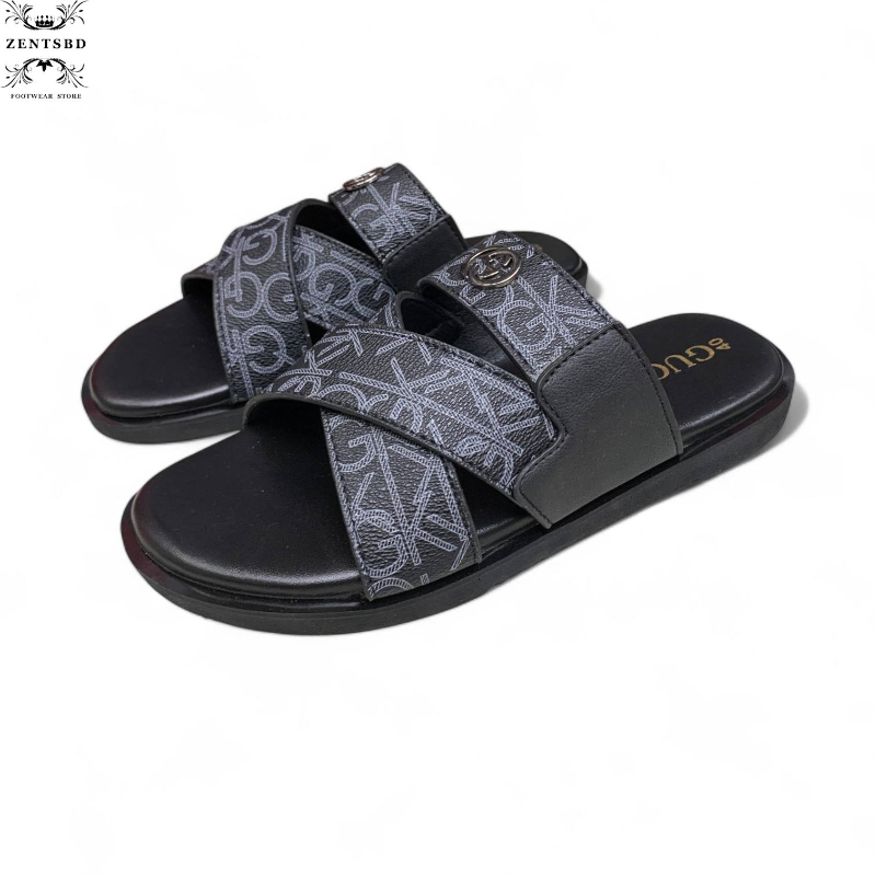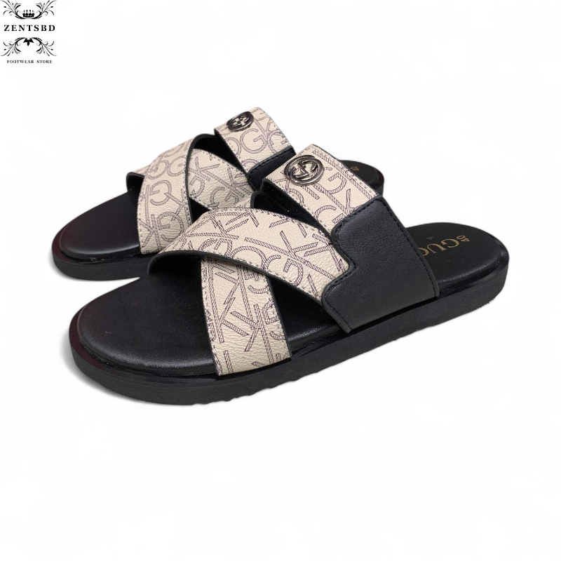 Elegant cross-strap slide design with stylish monogram pattern