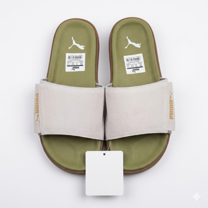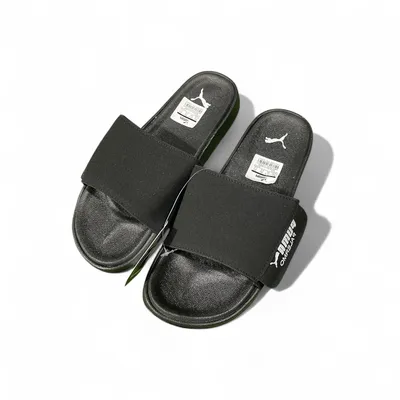 - The PUMA logo is prominently displayed on the foot bed and side of the strap.